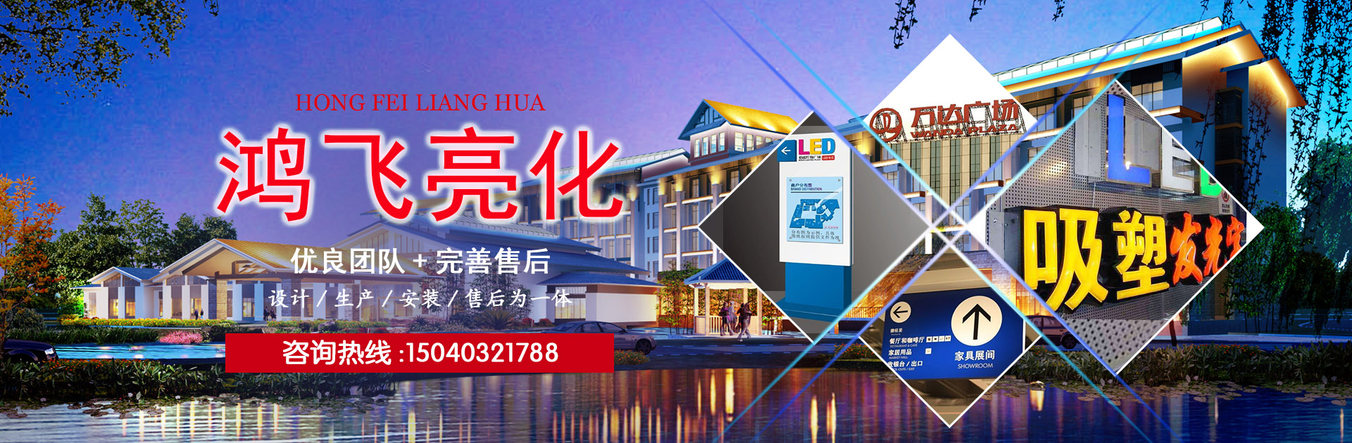 ABOUT沈陽(yáng)鴻飛亮化有限公司,成立于2009年,注冊(cè)資金200萬(wàn),本公司專業(yè)從事樓體亮化、LED發(fā)光字、樓頂大字、鋼結(jié)構(gòu)工程,是一家集設(shè)計(jì)、生產(chǎn)、安裝、售后為一體的綜合型公司。公司在不斷的拓展和創(chuàng)新過(guò)程中取得了沈陽(yáng)市城鄉(xiāng)建設(shè)委員會(huì)頒發(fā)的城市及道路照明工程叁級(jí)資質(zhì),AAA級(jí)信用等級(jí)證書等一系列榮譽(yù)。自公司成立以來(lái),活躍于各個(gè)行業(yè),為多家大型企業(yè)提供廣告解決方案,并多次承攬沈陽(yáng)市及周邊城市亮化工程,贏得了客戶及業(yè)內(nèi)人士的一致好評(píng),取得了良好的社會(huì)效應(yīng)。 公司擁有獨(dú)立廠房,配備了一系列的先進(jìn)生產(chǎn)設(shè)備,并且擁有一支技藝精湛素質(zhì)優(yōu)良的團(tuán)隊(duì),真誠(chéng)的為廣大客戶服務(wù)。以誠(chéng)信謀生存,以質(zhì)量求發(fā)展。沈陽(yáng)鴻飛亮化有限公司全體員工將以無(wú)限的熱情,精湛的技術(shù)為廣大客戶服務(wù)。..